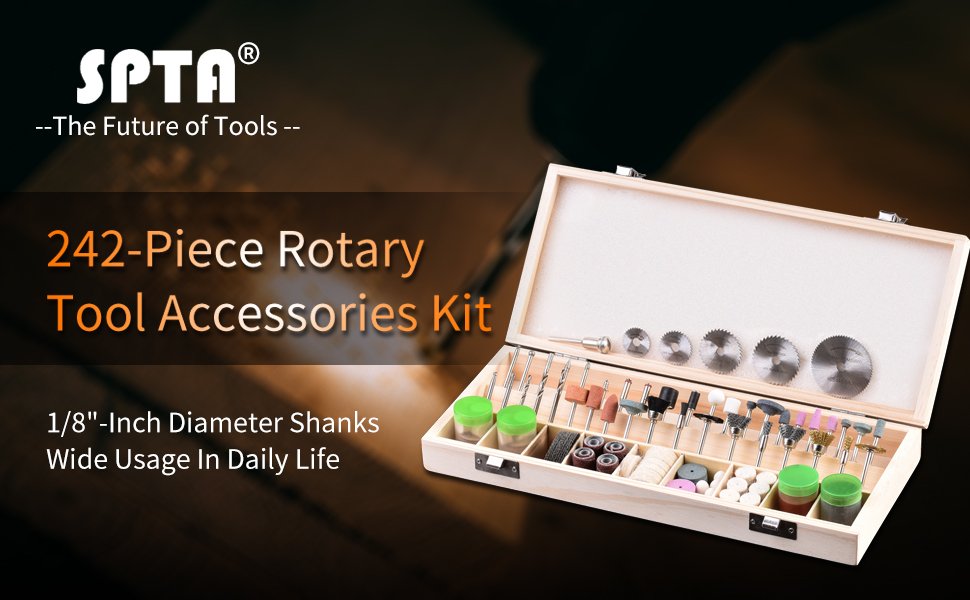 • ما ستحصل عليه: 242 قطعة من إكسسوارات SPTA داخل صندوق تخزين خشبي أنيق — متوافق مع طقم الأدوات الدوارة SPTA ومعظم الأدوات الشبيهة الأخرى 🎁🔧