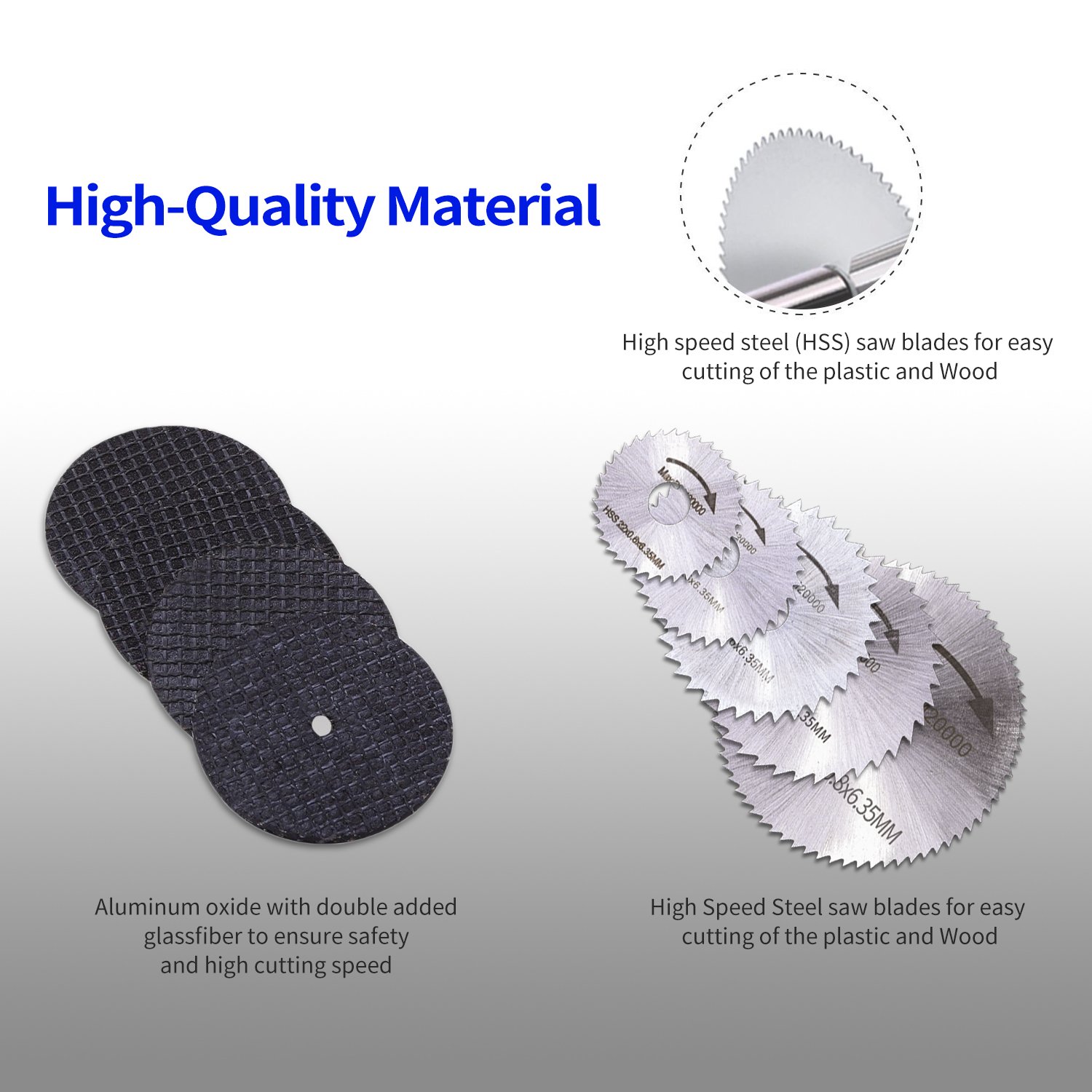 • شفرات منشار إضافية من الفولاذ المقاوم للصدأ: تشمل شفرات HSS عالية السرعة غير متوفرة في مجموعات أخرى، تتيح لك تقطيع البلاستيك والخشب بسهولة 🚀🪚